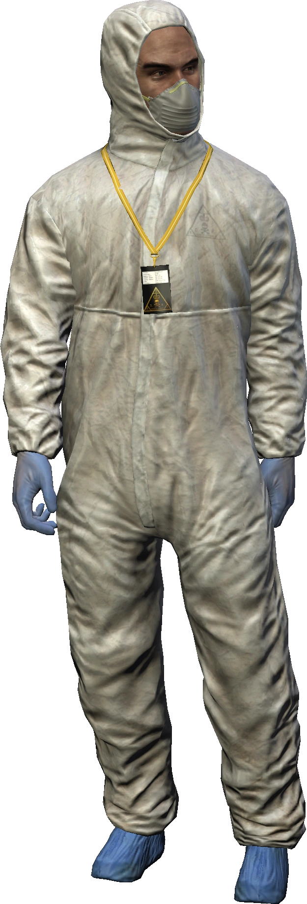 - "This outfit is worn by the ICA forensics expert. The contamination suit is standard field equipment for all technical operatives."