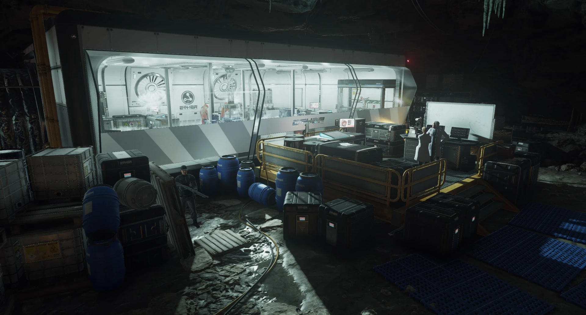 Located underneath the mansion of genius bioengineer Silvio Caruso, the Ether Field Lab was designed by his employer for the purposes of studying and developing the virus prototype in his own backyard, as a way of accommodating his agoraphobia. It features several modular units for scientific purposes as well as the quarantine unit that houses the viral sample itself in cold storage. The Lab and its staff are protected by armed CICADA security guards in addition to security cameras.
