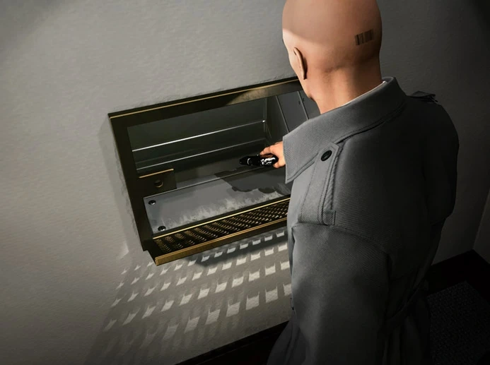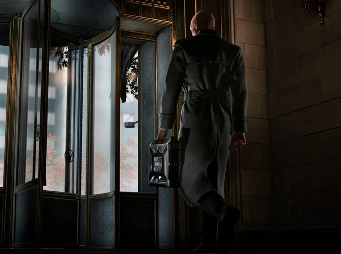 In the hallway between the interview room and the stairway to level 2, there are portraits of former Milton-Fitzpatrick CEOs. If you shoot out the lights above all of the portraits except Mette P. Anderson, the key for deposit box 577 will appear on Anderson's portrait. Unlocking the box with this key will reveal a gold idol. Place the idol on the pedestal next to the empty crate in the corner of the storage room, next to the IT room, then, whilst in The New Yorker or The New Yorker with Gloves, hide in the crate and then exit it. A black and white filter will be applied, 47 will be sporting a fedora, and a musical sting will indicate the easter egg has worked. This only works as long as you have the suit on, This is a reference to the classic-era (1940s & 1950s) of Film Noir.