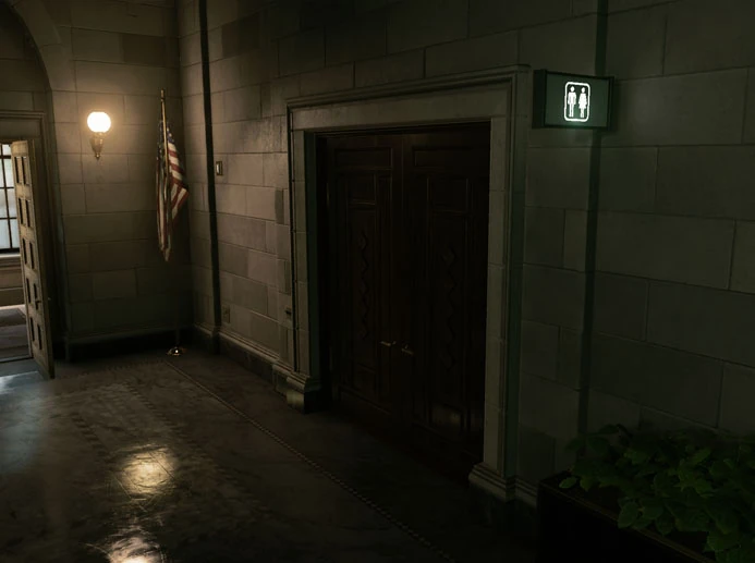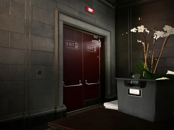 There is a secret Easter Egg exit: if you have completed the mission and crashed the stock market, then whilst you are disguised as an Investment Banker or the Fired Banker you will be able to exit via the window by the main stairway to the top floor, which will result in 47 casually stepping off the ledge, with a cartoony whistling sound indicating his fall. This is a reference to the Wall Street Crash of 1929, which was a major contributor to the Great Depression, and supposedly led to dozens of investors and stockbrokers leaping from high-rising buildings to their deaths, although this was proven later to be just a myth.