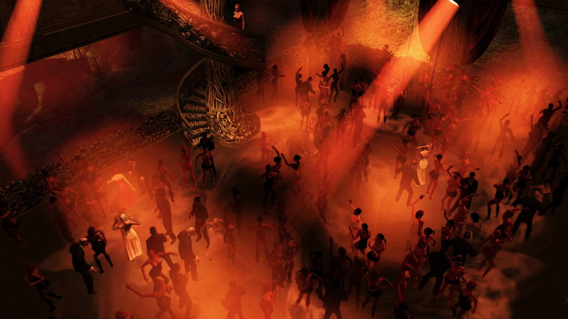 At the Hell Club, a hallway goes to the main hall with a balcony and a spiral staircase down to a large dance floor with a giant aquarium with sharks overlooking it. In the hallway are a bar (with Maynard John pretending to be a bartender), a private room stylized as Satan's chamber with a throne, and a door to the employee's area. Another hallway has private chambers on the sides, behind cages, for attendees to make out; it ends at the "Torture Chamber" - a soundproof storage room. Over the aquarium is Vaana Ketlyn's stage with pyrotechnics. Employee's areas are a storage room for party decor, corridors that lead to a projection booth that can project the film in the "Satan's chamber," and a pyrotechnics control room with the aquarium on the floor behind the railings.