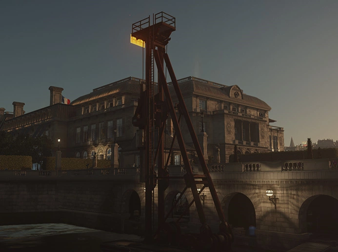 47 has chosen a sniper vantage point overlooking the rear of the palace and begins the mission atop the pile-driver barge (Mastery Level 8 on HITMAN™ Professional Difficulty). |