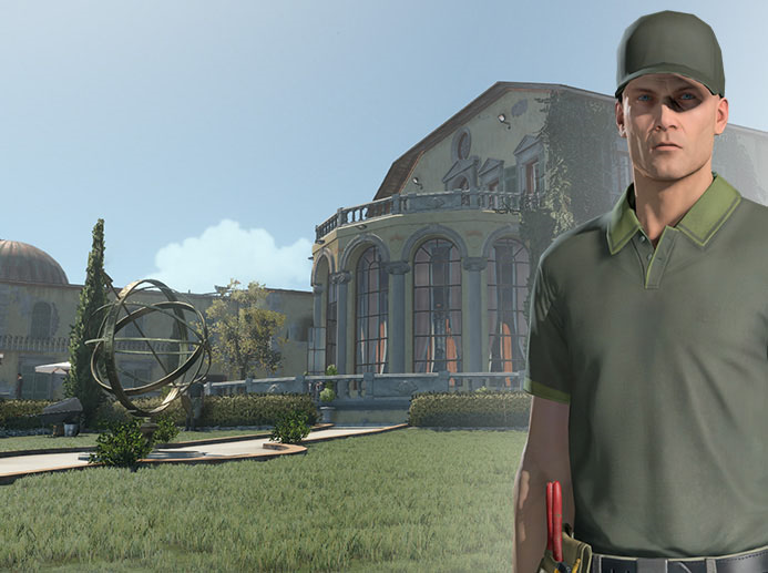 47 has infiltrated the mansion and now begins the mission as one of the gardeners (Mastery Level 3 on HITMAN™ Professional Difficulty). |
