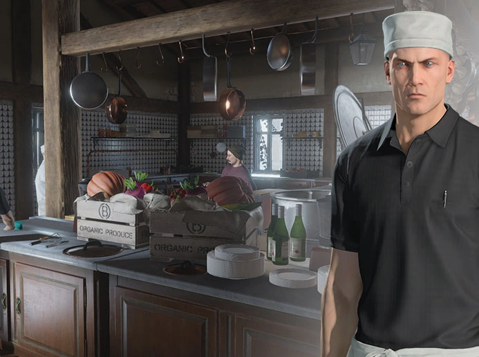 47 has infiltrated the mansion kitchen and begins the mission disguised as a chef (Mastery Level 4 on HITMAN™ Professional Difficulty). |
