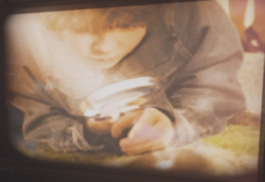 The image appears to depict Silvio himself, perhaps looking at insects in a magnifying glass. With the sunlight reflecting into the glass, he might actually be trying to burn something alive. A woman's legs can be seen in the upper corner, potentially being his mother. |