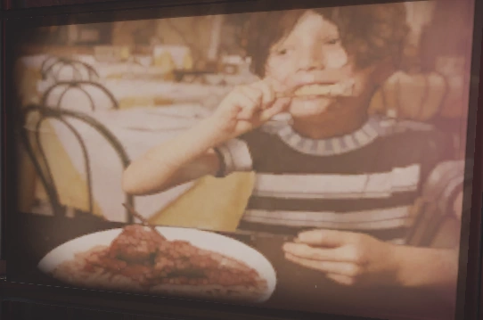 The image appears to depict Silvio eating something. The plate looks like it contains spaghetti bolognese and could possibly be his mother's family recipe. It seems however that he's eating some type of chicken or meat on a bone, and also based on the tables behind him, that he's at a restaurant. It could also be a dining hall with a different layout to how the one at today's Villa Caruso looks like. |