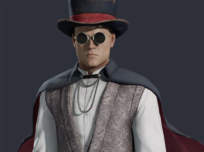 The outfit consists of a worn top hat, dress shirt with waistcoat, black slacks, round sunglasses, and, most conspicuously, a black cape with red lining. The black-red color scheme mimics the colors of Agent 47's signature suit. The disguise is tolerated in some parts of the first floor but on all other floors it is considered trespassing.